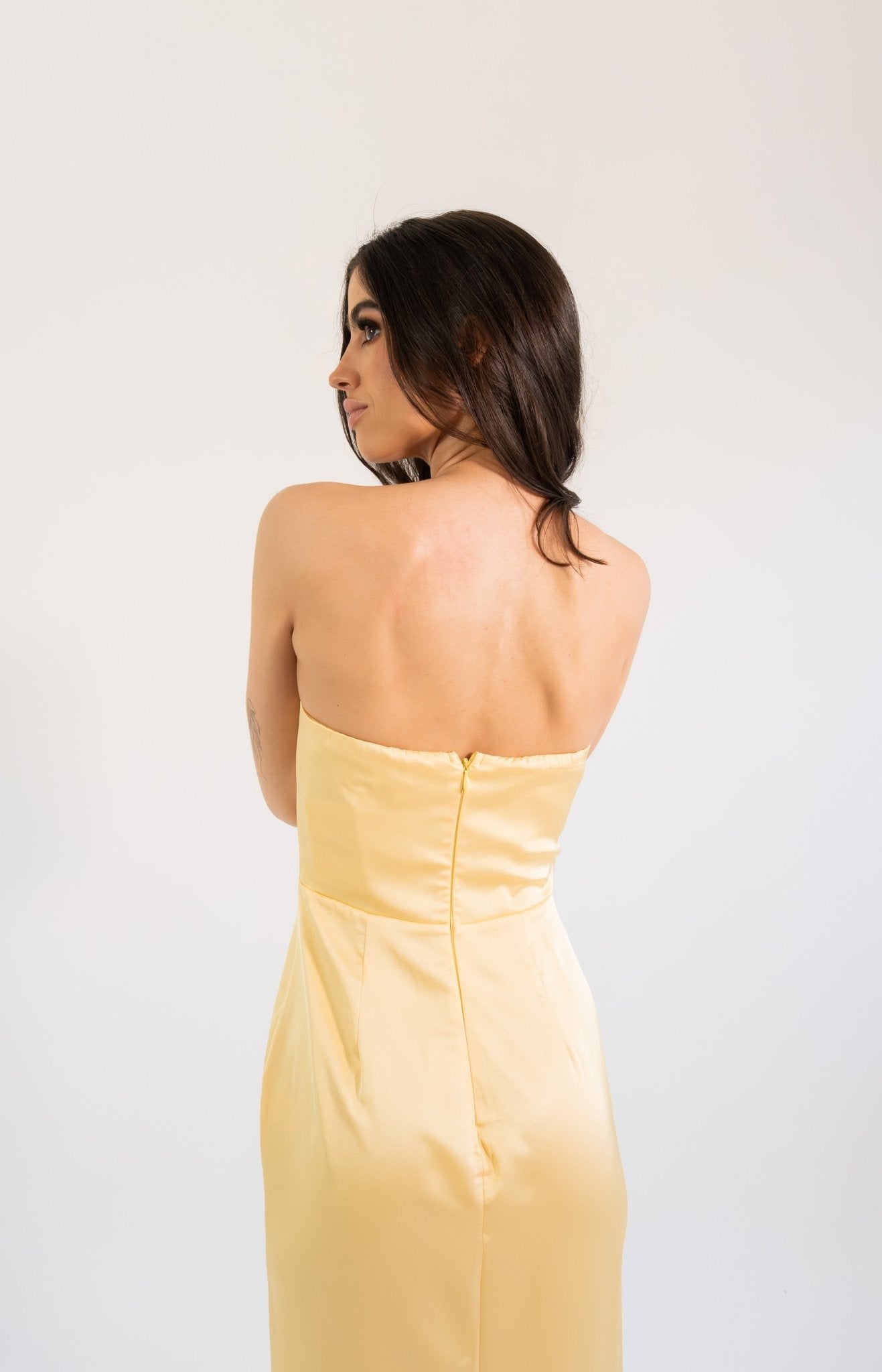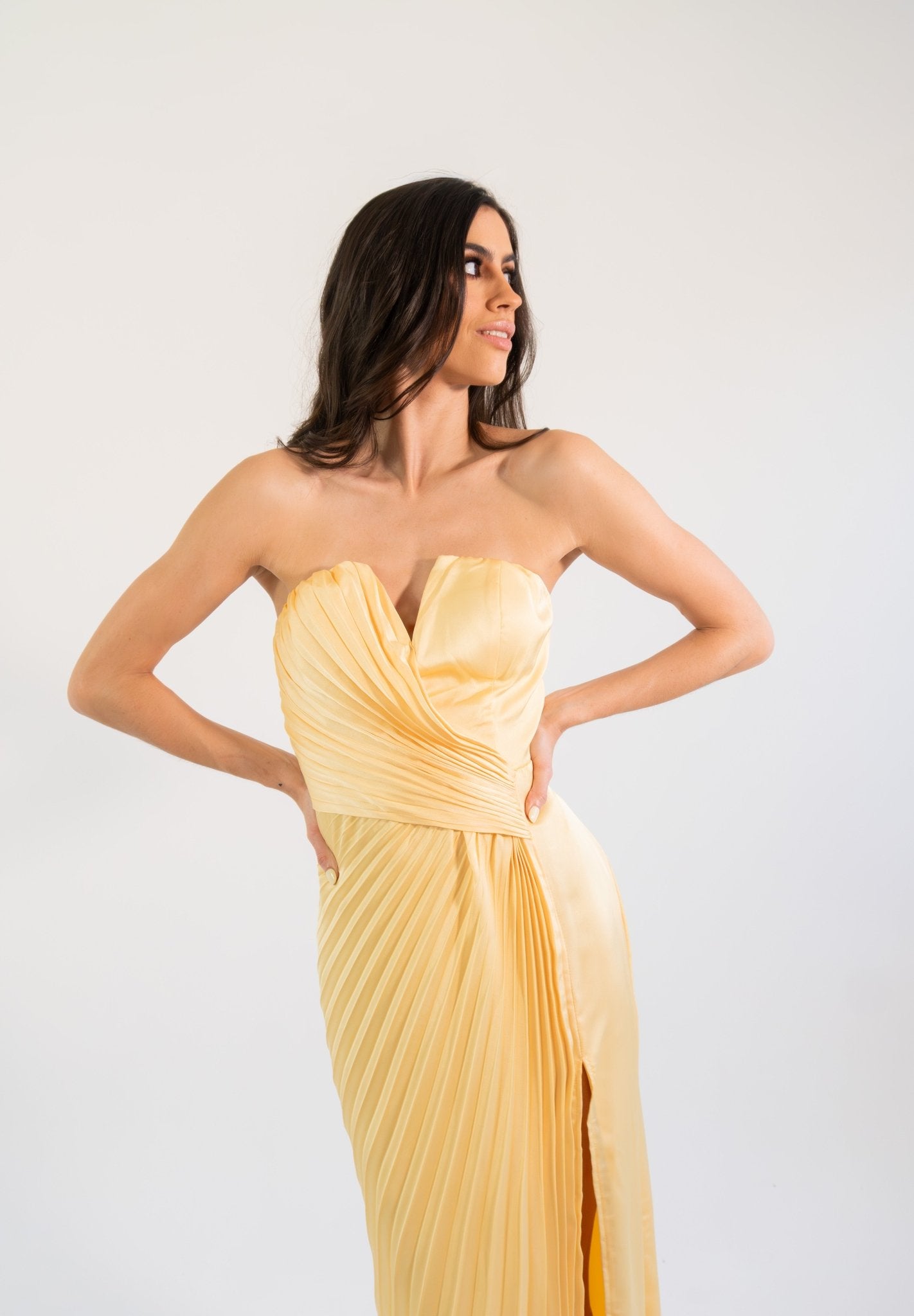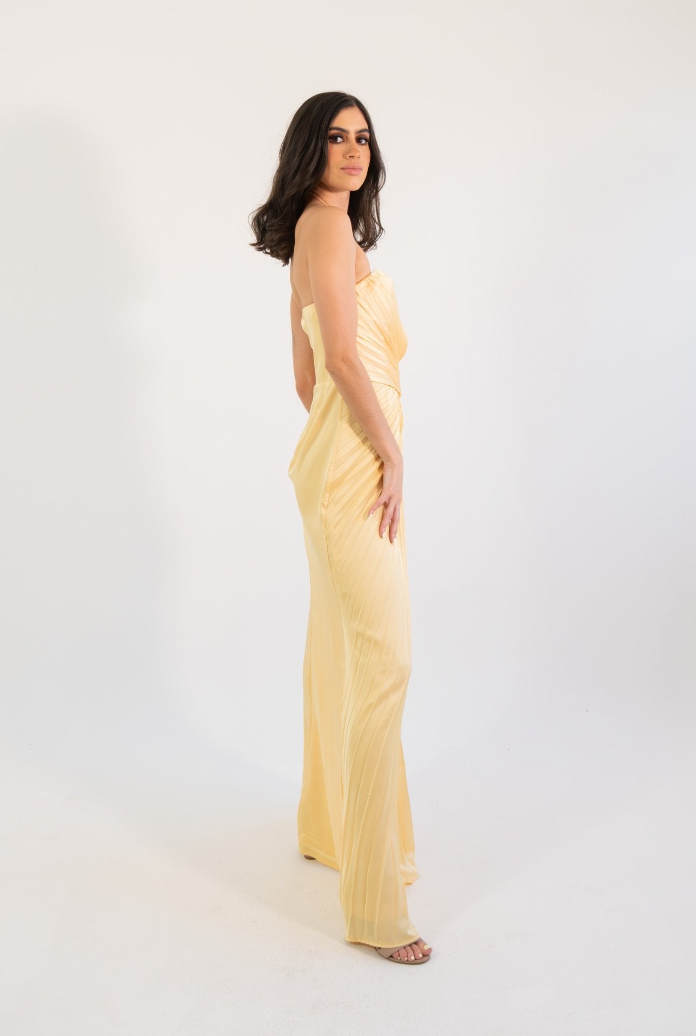 Un diseño elegante y luminoso que destaca por su corte strapless y su exquisito satín plisado, creando una silueta estilizada y refinada. El detalle de pliegues cruzados en el torso realza la figura con delicadeza, mientras que la abertura lateral aporta un toque sutil de sensualidad y movimiento. Su caída fluida en corte maxi alarga visualmente la silueta, logrando un look atemporal y sofisticado.
