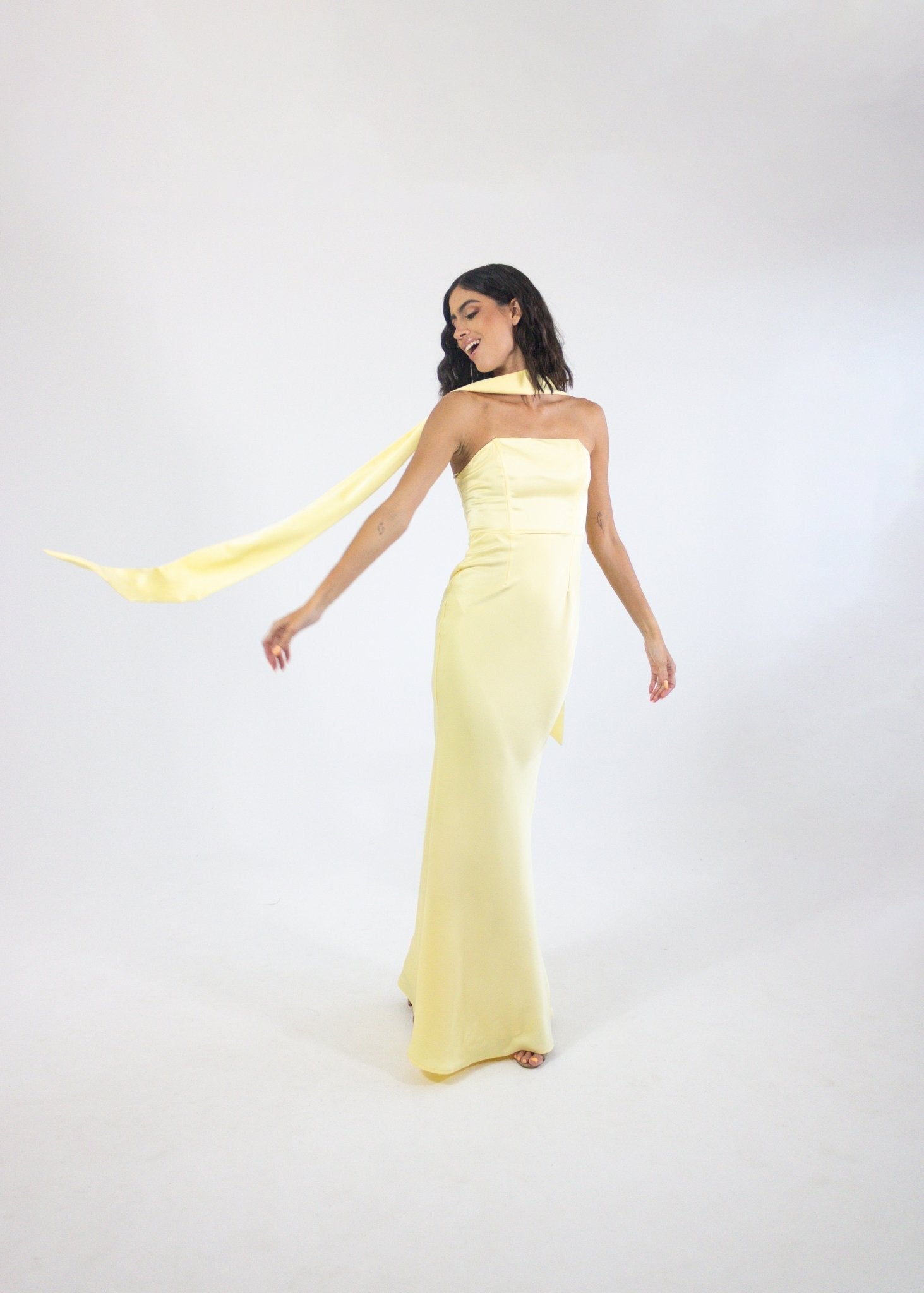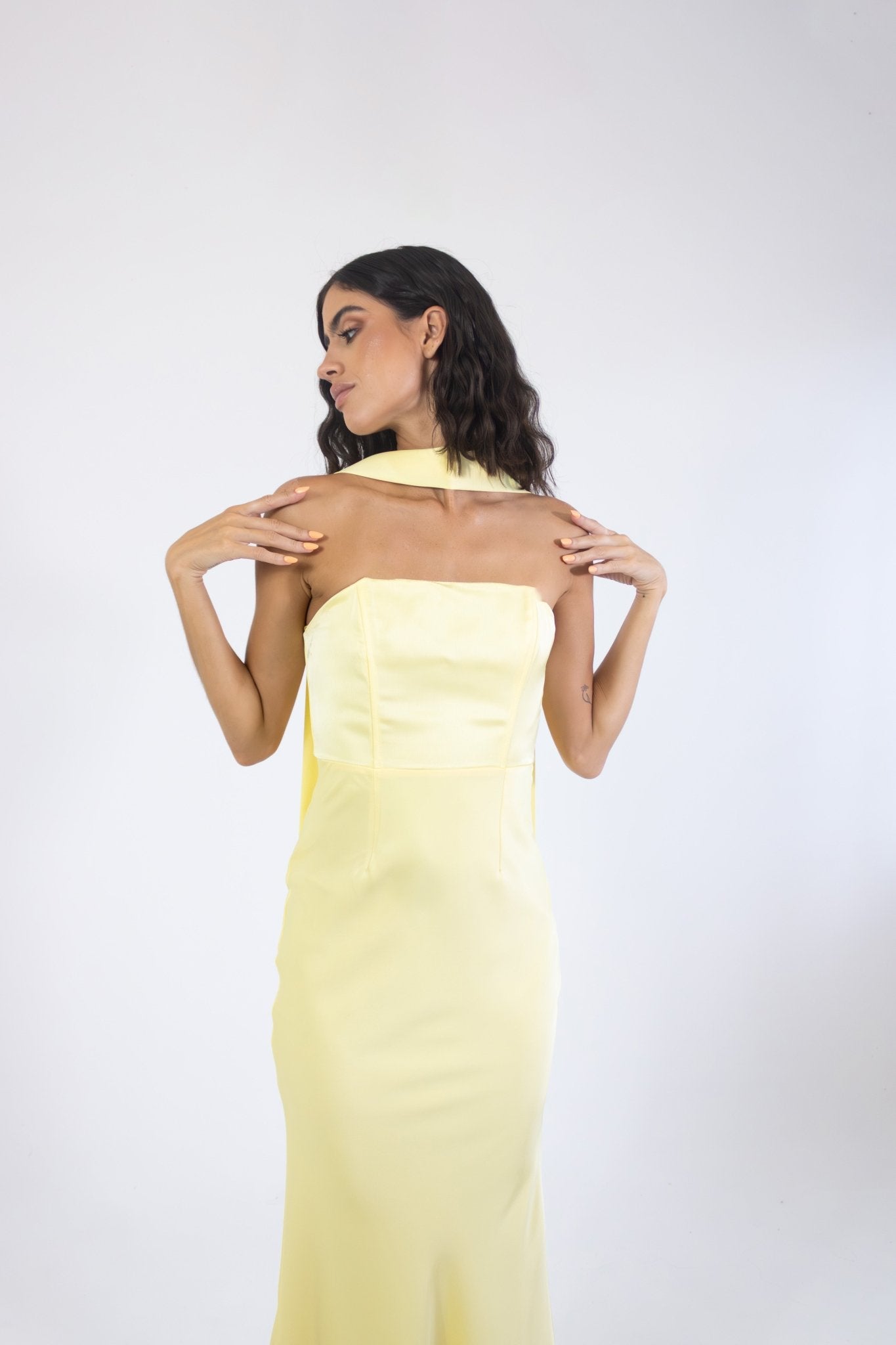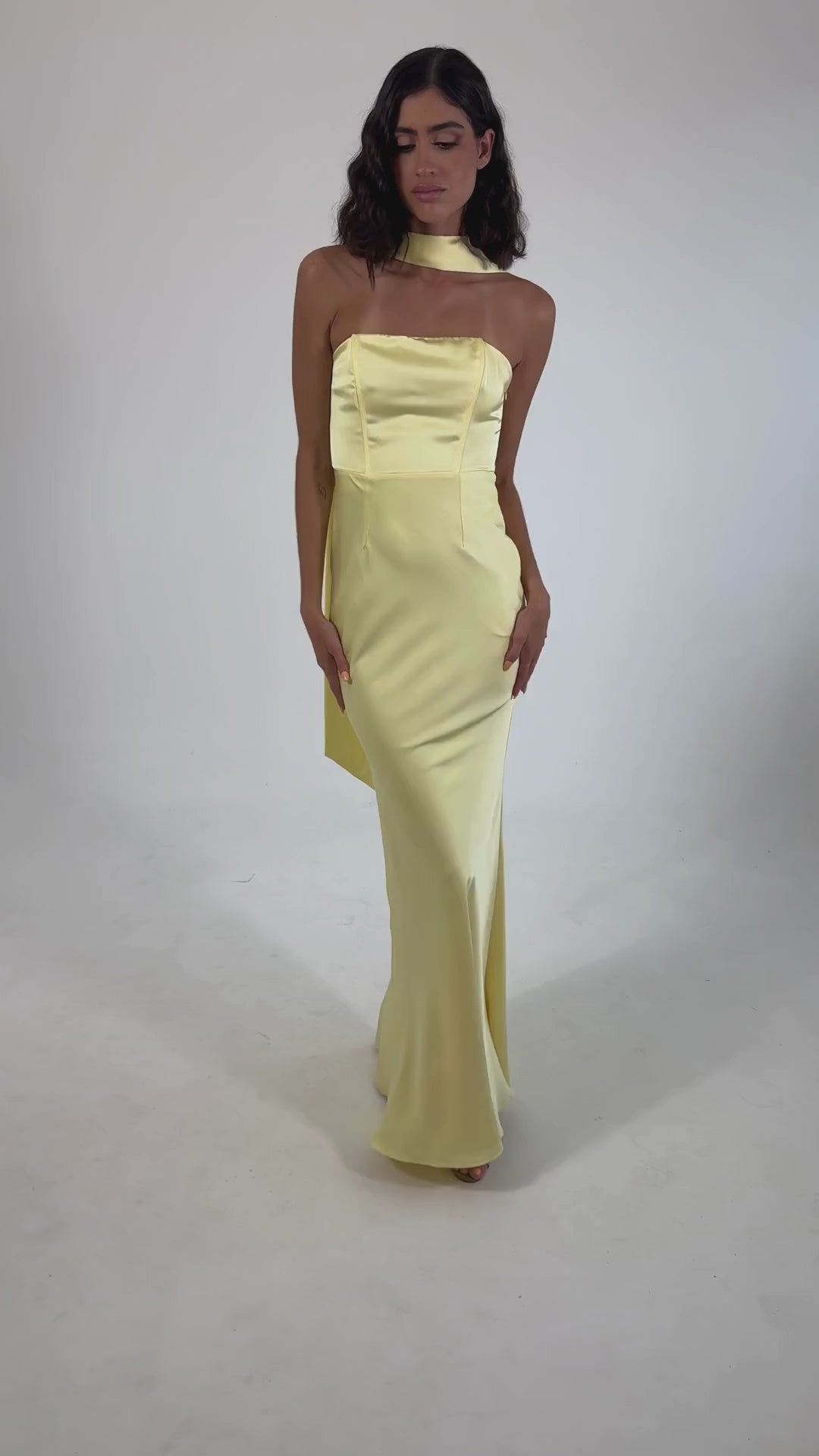Este vestido largo de satén con escote bandeau realza tu elegancia natural, mientras que el pañuelo a juego te permite crear múltiples estilos únicos. Perfecto para destacar en cualquier ocasión especial, te invita a expresar tu lado más sofisticado y femenino con comodidad y glamour.