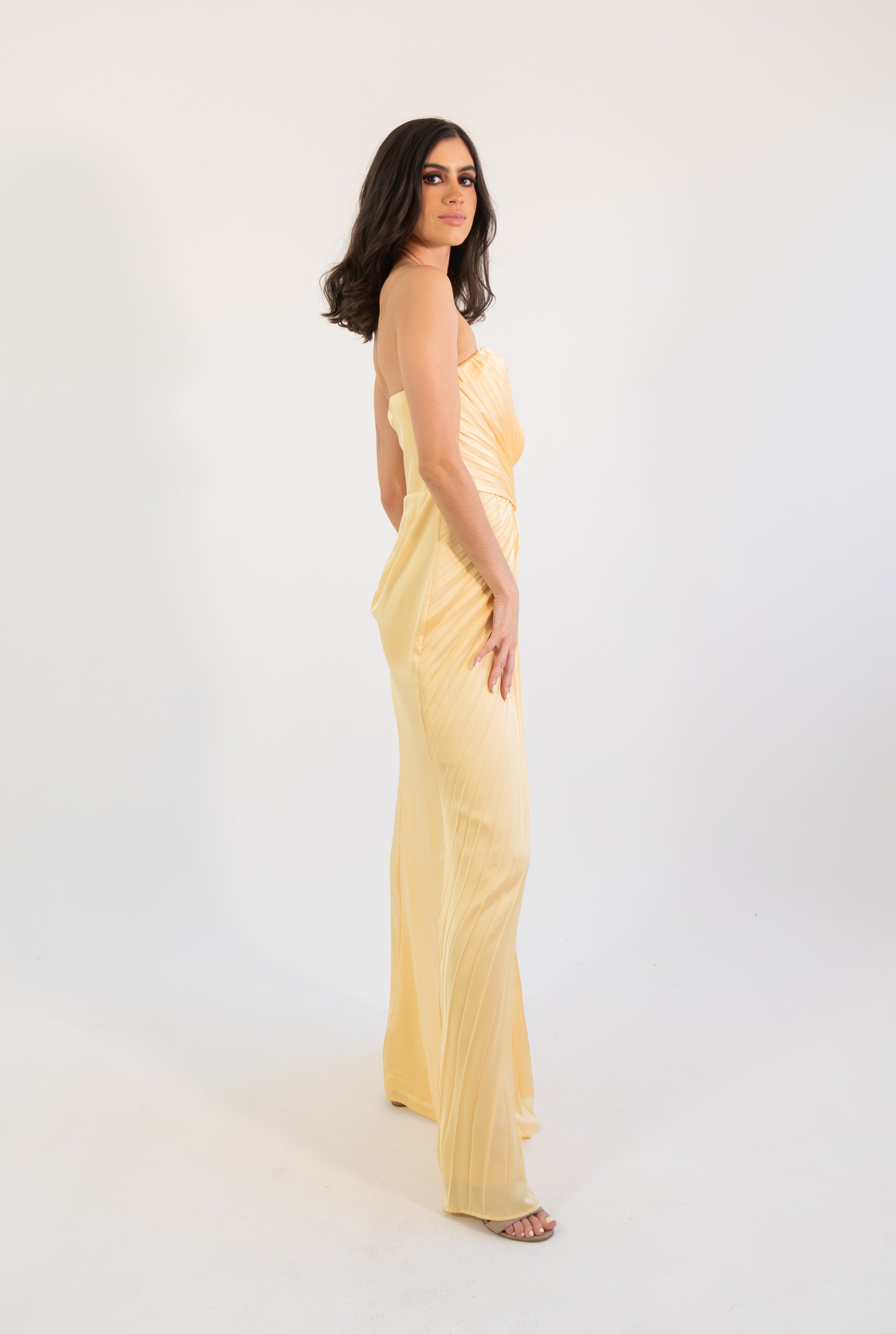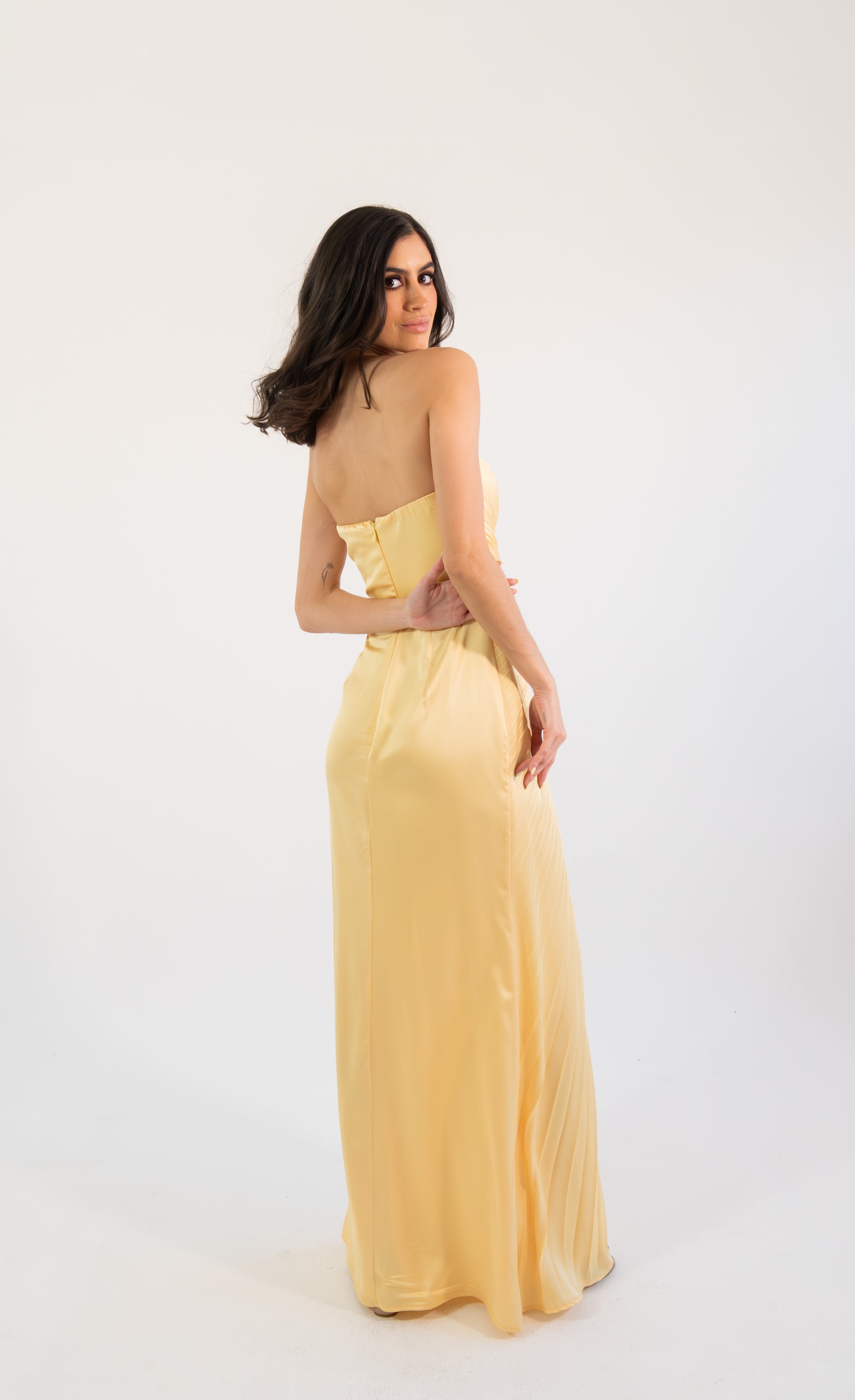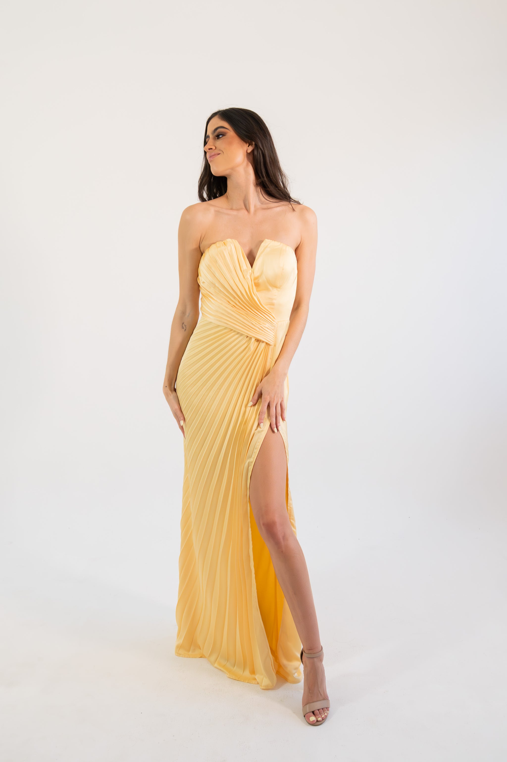Un diseño elegante y luminoso que destaca por su corte strapless y su exquisito satín plisado, creando una silueta estilizada y refinada. El detalle de pliegues cruzados en el torso realza la figura con delicadeza, mientras que la abertura lateral aporta un toque sutil de sensualidad y movimiento. Su caída fluida en corte maxi alarga visualmente la silueta, logrando un look atemporal y sofisticado.