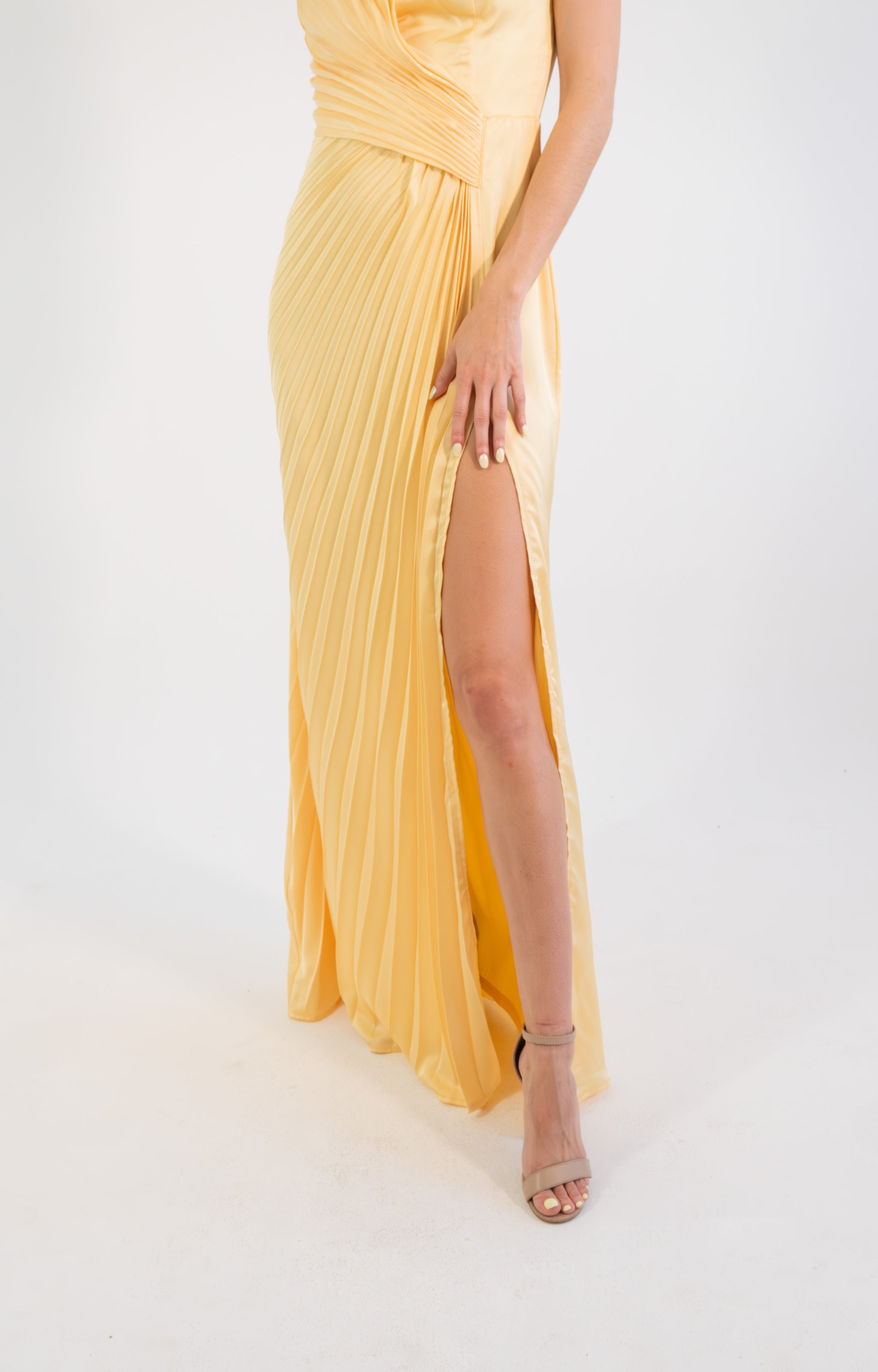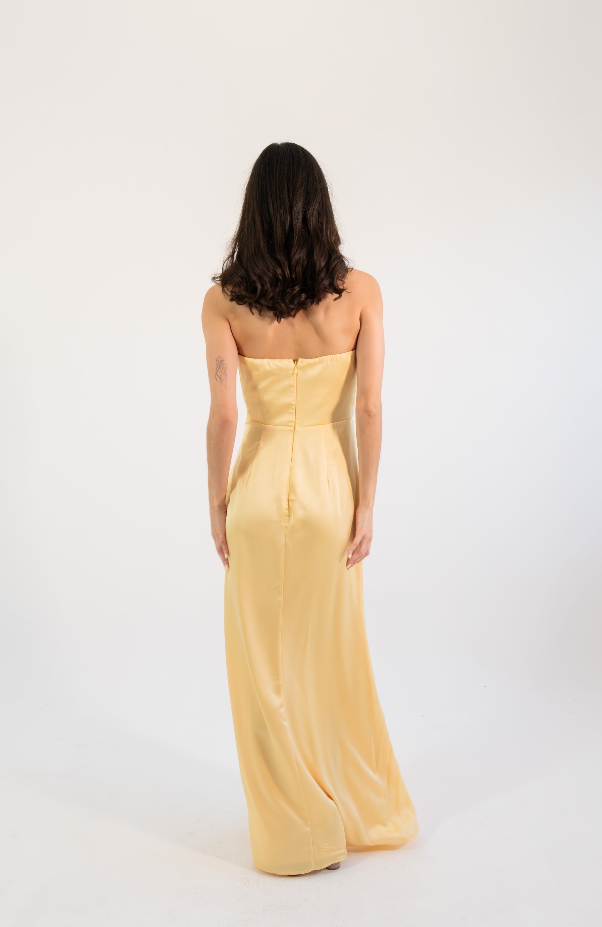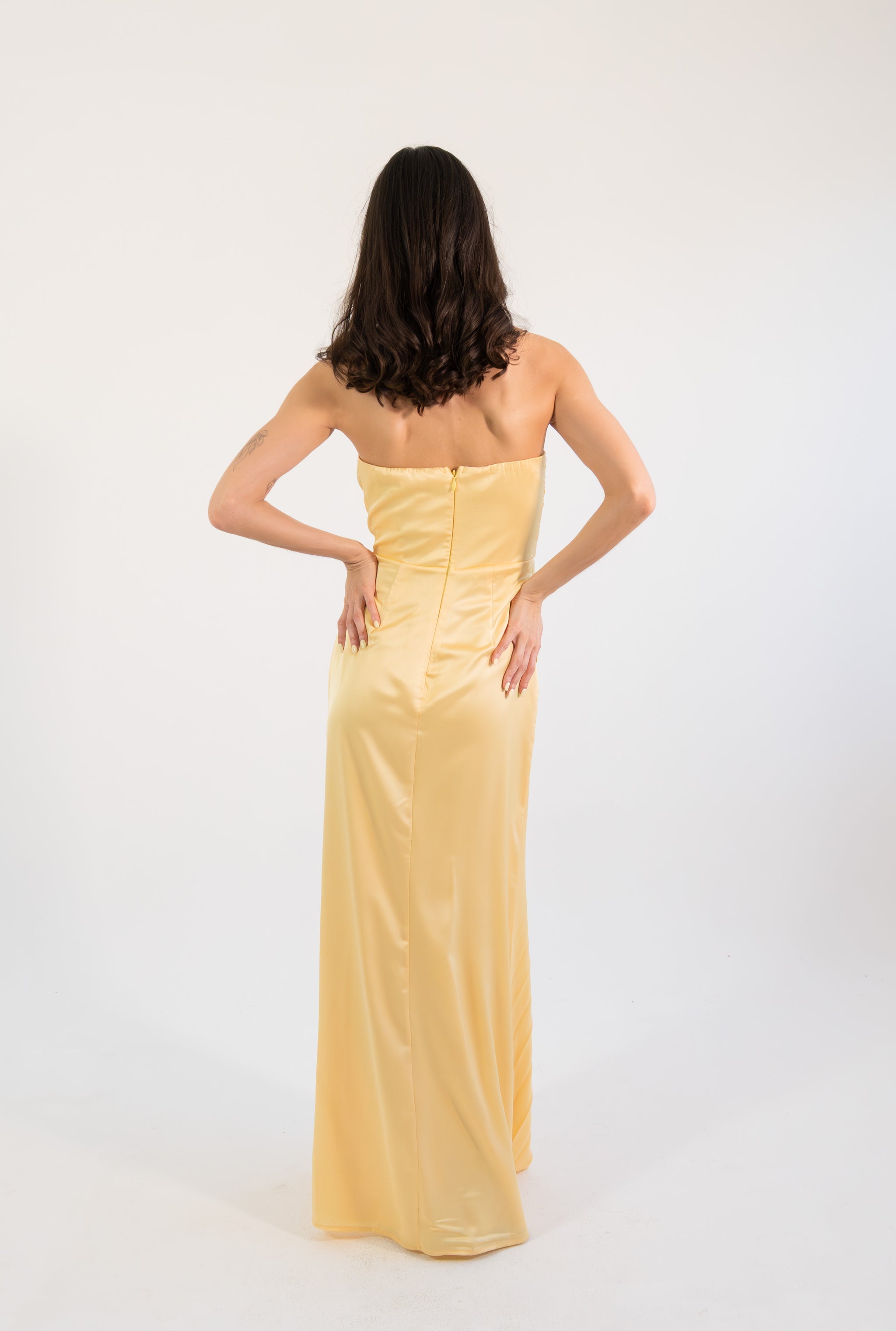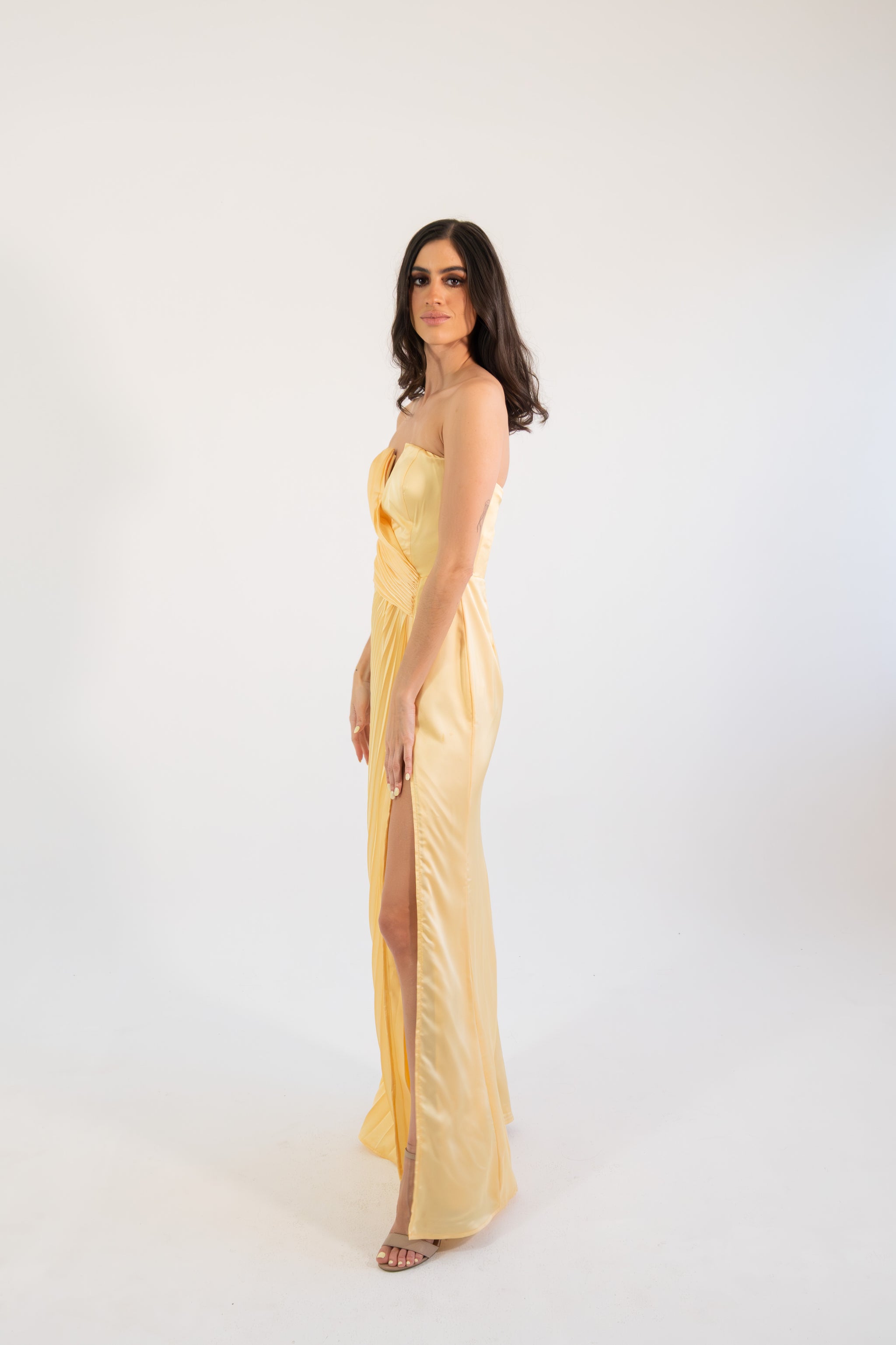 Un diseño elegante y luminoso que destaca por su corte strapless y su exquisito satín plisado, creando una silueta estilizada y refinada. El detalle de pliegues cruzados en el torso realza la figura con delicadeza, mientras que la abertura lateral aporta un toque sutil de sensualidad y movimiento. Su caída fluida en corte maxi alarga visualmente la silueta, logrando un look atemporal y sofisticado.