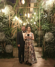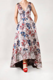 Un vestido coqueto y femenino de princesa, con un corte en escote, y espalda semi descubierta, es un vestido asimétrico que le da el toque perfecto para no ser el vestido convencional. Ideal para eventos tanto de día como de noche, por su estampado fresco y elegante.