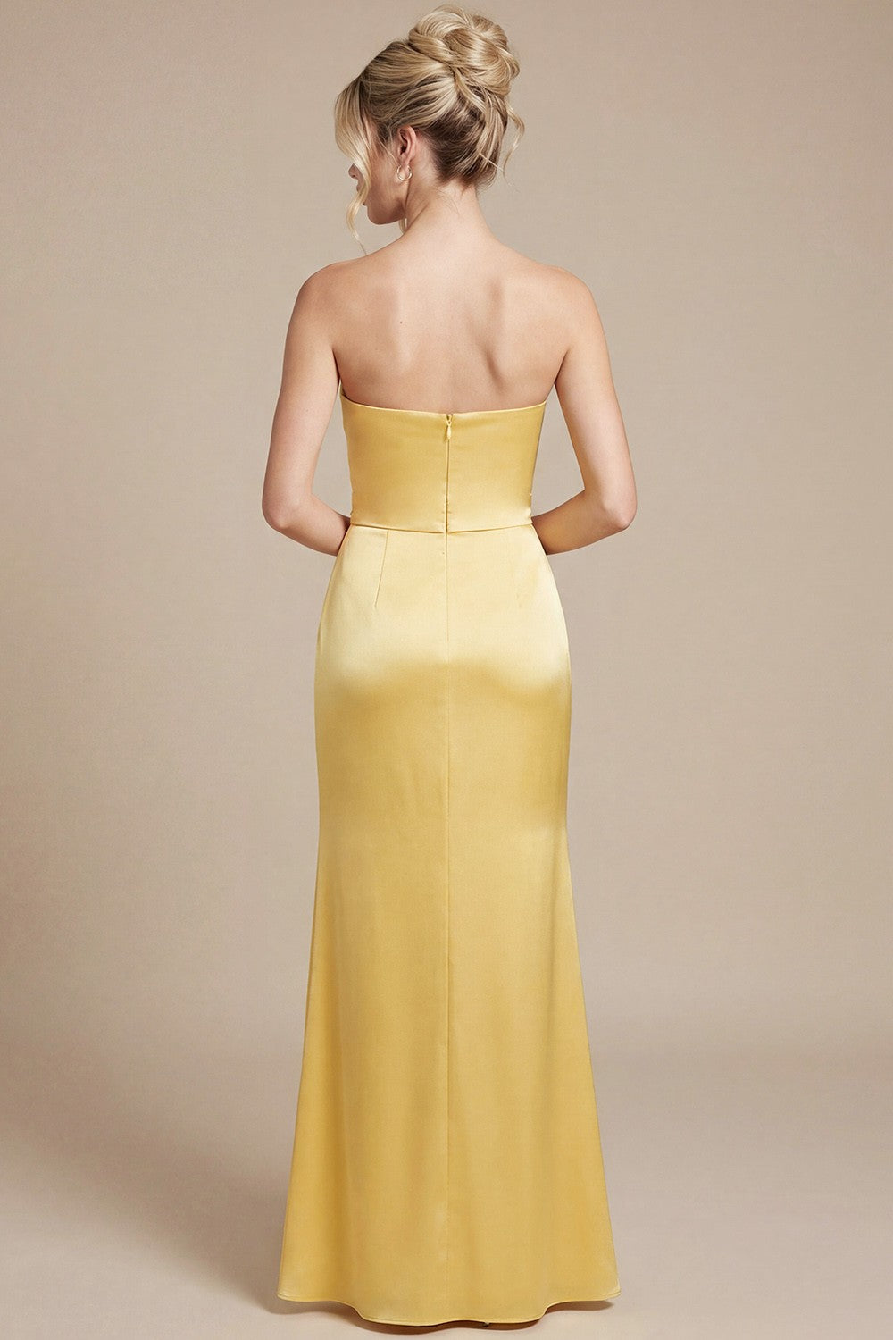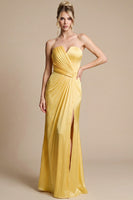 Un diseño elegante y luminoso que destaca por su corte strapless y su exquisito satín plisado, creando una silueta estilizada y refinada. El detalle de pliegues cruzados en el torso realza la figura con delicadeza, mientras que la abertura lateral aporta un toque sutil de sensualidad y movimiento. Su caída fluida en corte maxi alarga visualmente la silueta, logrando un look atemporal y sofisticado.