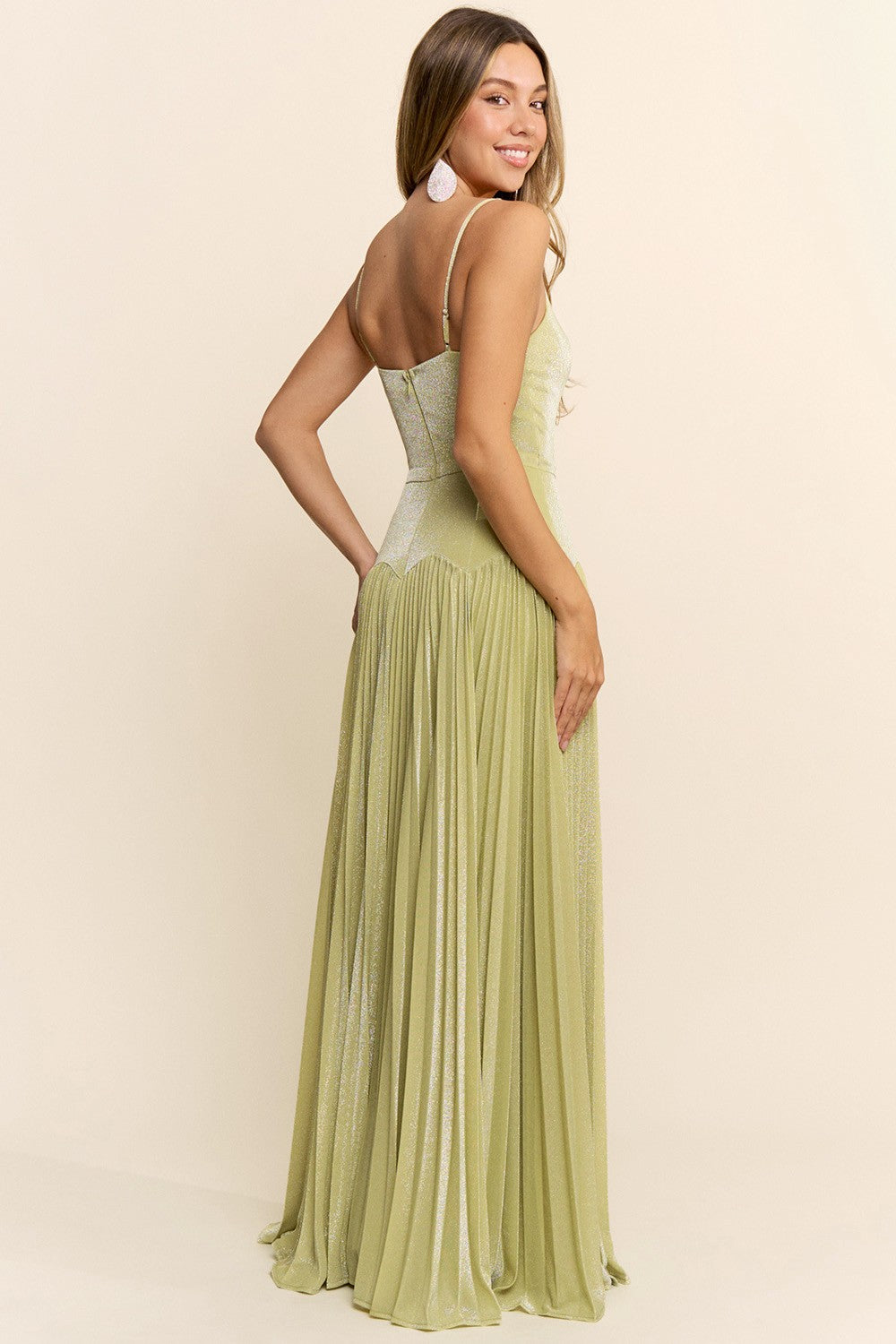 Su escote recto con tirantes finos aporta un equilibrio perfecto entre delicadeza y estructura, mientras el cuerpo ajustado realza la figura con un acabado limpio y sofisticado. La falda plisada cae con fluidez desde la cintura, creando un efecto etéreo que acompaña cada paso con gracia.
